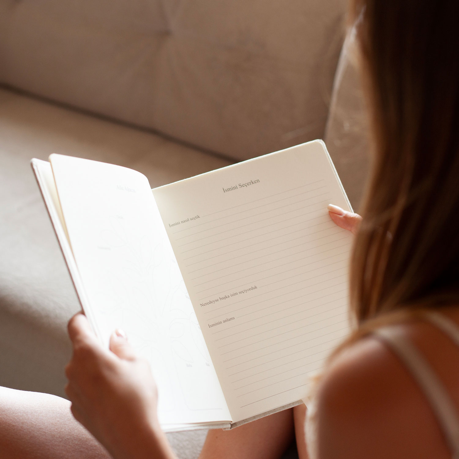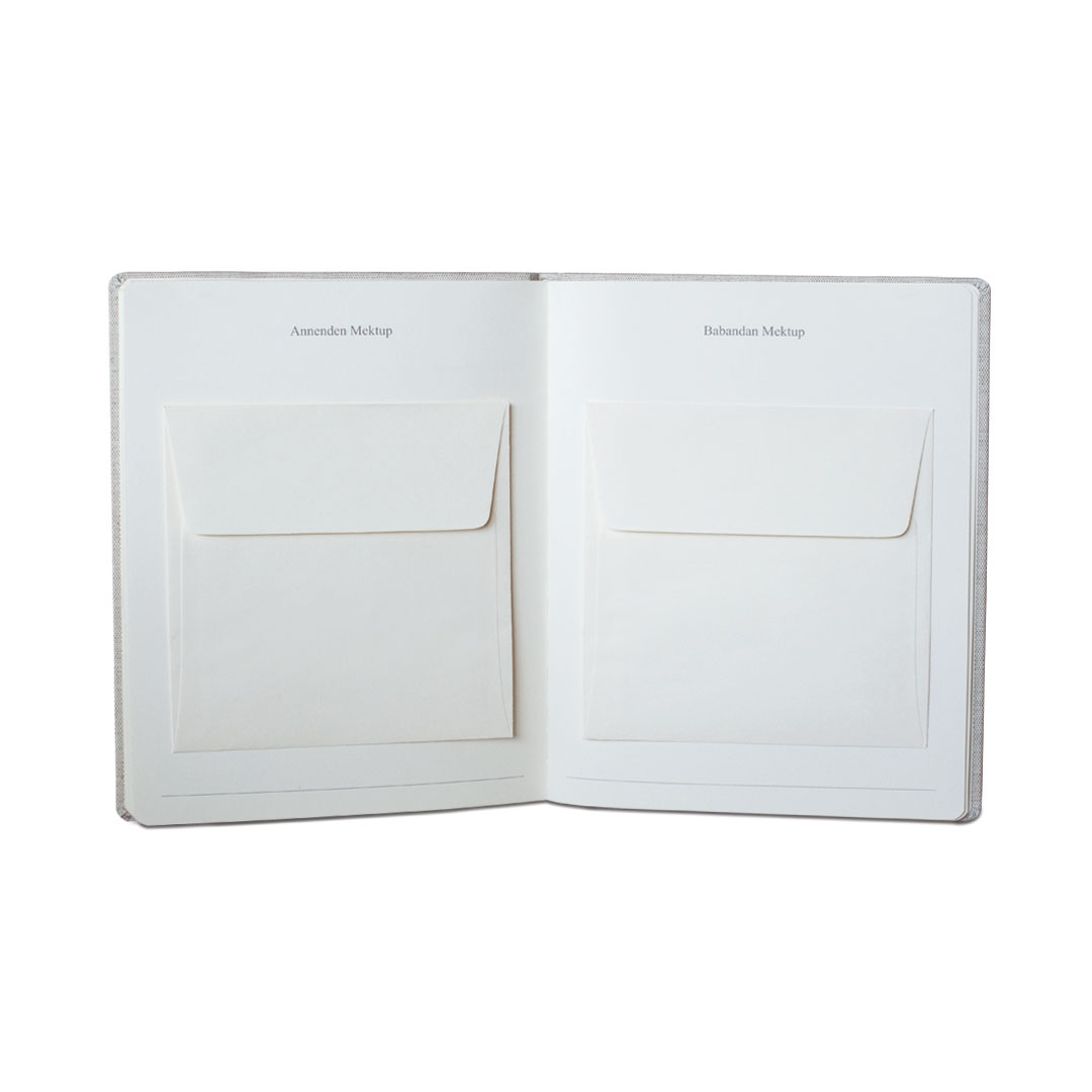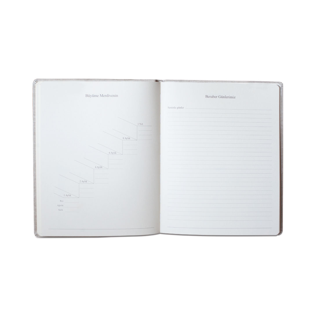 Yeni başlangıçlar Seni ilk gördüğümüz gün Gelişini nasıl paylaştık Seni beklerken Biz Seni Bekleyenler Aile Ağacın İsmini Seçerken Babyshower Odan Odanı Hazırlarken İlk Fotoğrafın Doğum Hikayen İlk Aile fotoğrafımız El ve Ayak İzin Evine hoş geldin İlk Banyon İlk Günlerimiz 1-2-3-4-5-6-7-8-9-10-11-12 Aylık Oldun Büyüme merdivenin Beraber Günlerimiz İlk saç kesimin Saçından bir parça (zarflı sayfa) İlk arkadaşın Tüylü dostların İlk emekleme İlk yüzüşün İlk tatilin İlk dişin Söylediğin Komik Sözler Favorilerin İlk Yılbaşın İlk çizimlerin İlklerin İlk doğum günün Annenden-Babandan mektup (zarflı sayfalar) Fotoğrafların Özel AnılarHer günlük güzel keten/kumaşla kaplanmış ve ön, arka ve sırtta altın varak vurgularla damgalanmış, keten/kumaş bir hatıra kutusunda gelir. İleride çocuğunuza armağan edebilmeniz için kendi kutusu ile beraber tasarlandı.